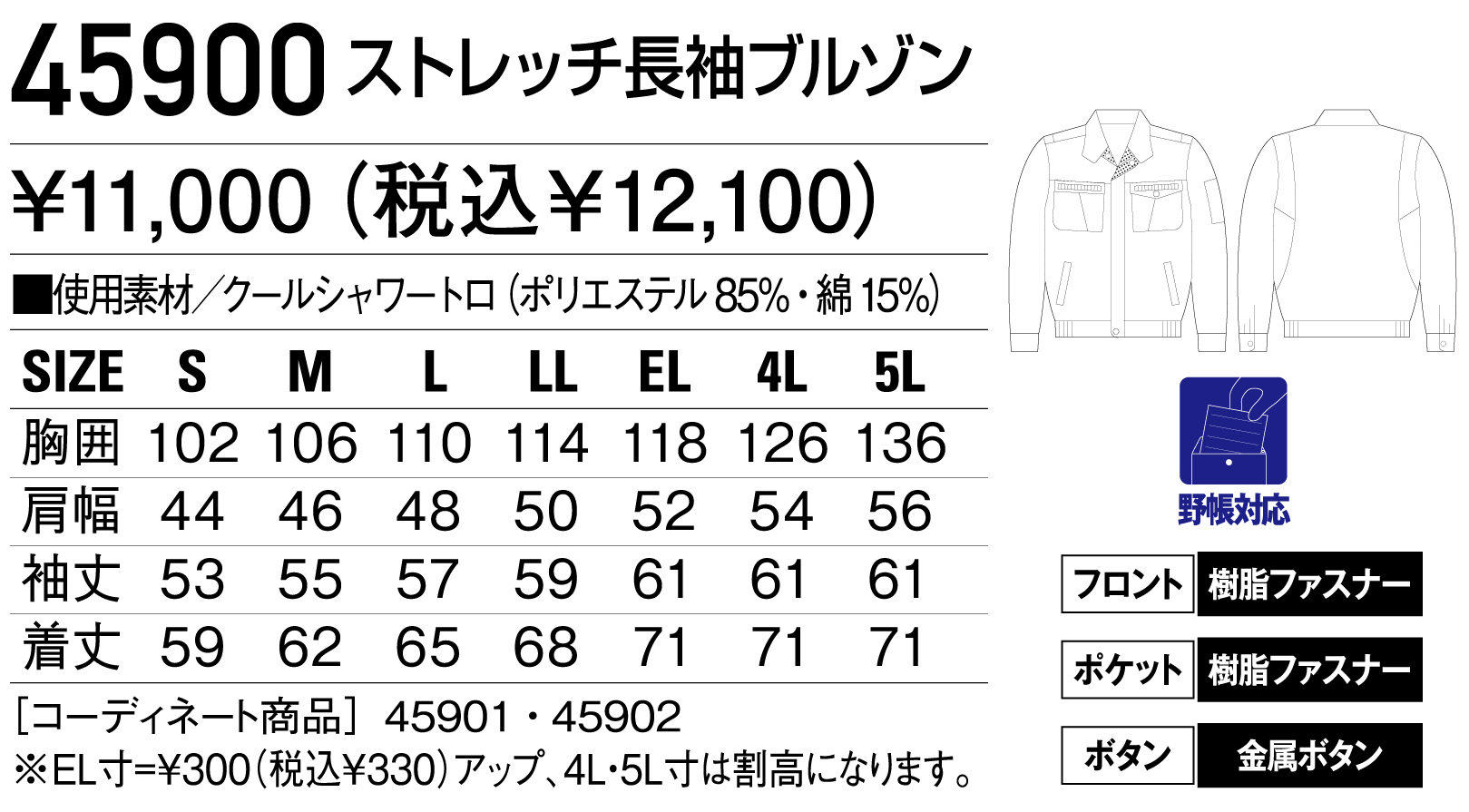 TOPページ > アイテムから探す > 作業服(上着) > 春夏用長袖ブルゾン > 自重堂春夏用長袖ブルゾン一覧 > 45900
