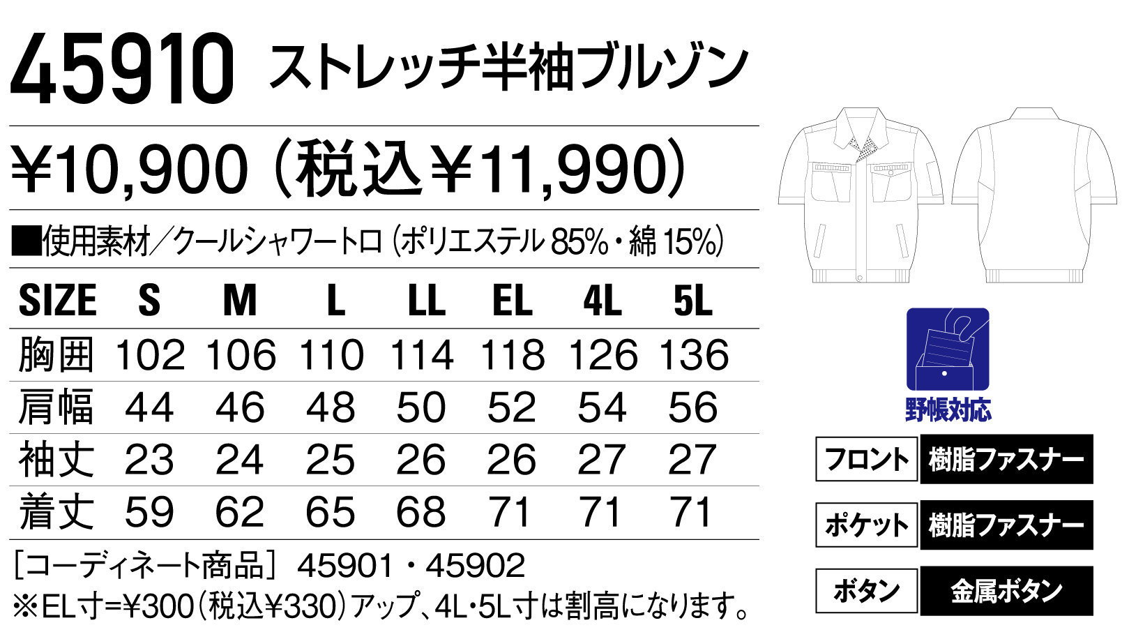 【自重堂】 春夏用ストレッチ半袖ブルゾン / 45910