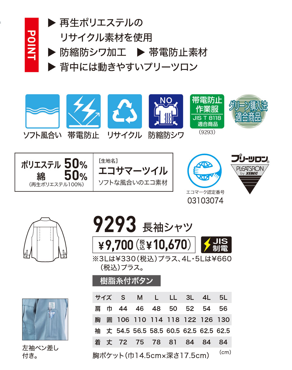 TOPページ > エコユニフォーム > エコユニフォーム商品一覧 > 長袖シャツ(春夏用薄手生地)(エコマーク認定(グリーン購入法認定)) > xe9293