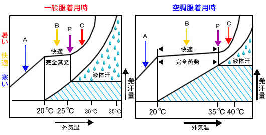 | 下図はファン付き作業服の場合での説明図です、左図は一般の服を着ている場合で、横軸は温度、左縦軸は人が感じる暑さ・寒さ、右横軸は発汗量を示しています。個々人で多少異なりますが、Aの領域(20℃以下)では寒く汗は出ていません。Bの領域(20〜26℃)は快適な範囲です。この時には脳からの指令で汗が出ますが、量が少ないためにすぐに蒸発して、丁度よく体温をコントロールしています。Cの領域では体温をもっと冷やせという脳からの指令で、より多くの汗が出て完全蒸発出来ずに一部が液体状の汗となってしまいます。汗は蒸発しなければ体を冷却することができないので、いわゆる『汗』が出ると生理クーラーの有効範囲をはずれてしまい暑苦しくなります。 | ||||||